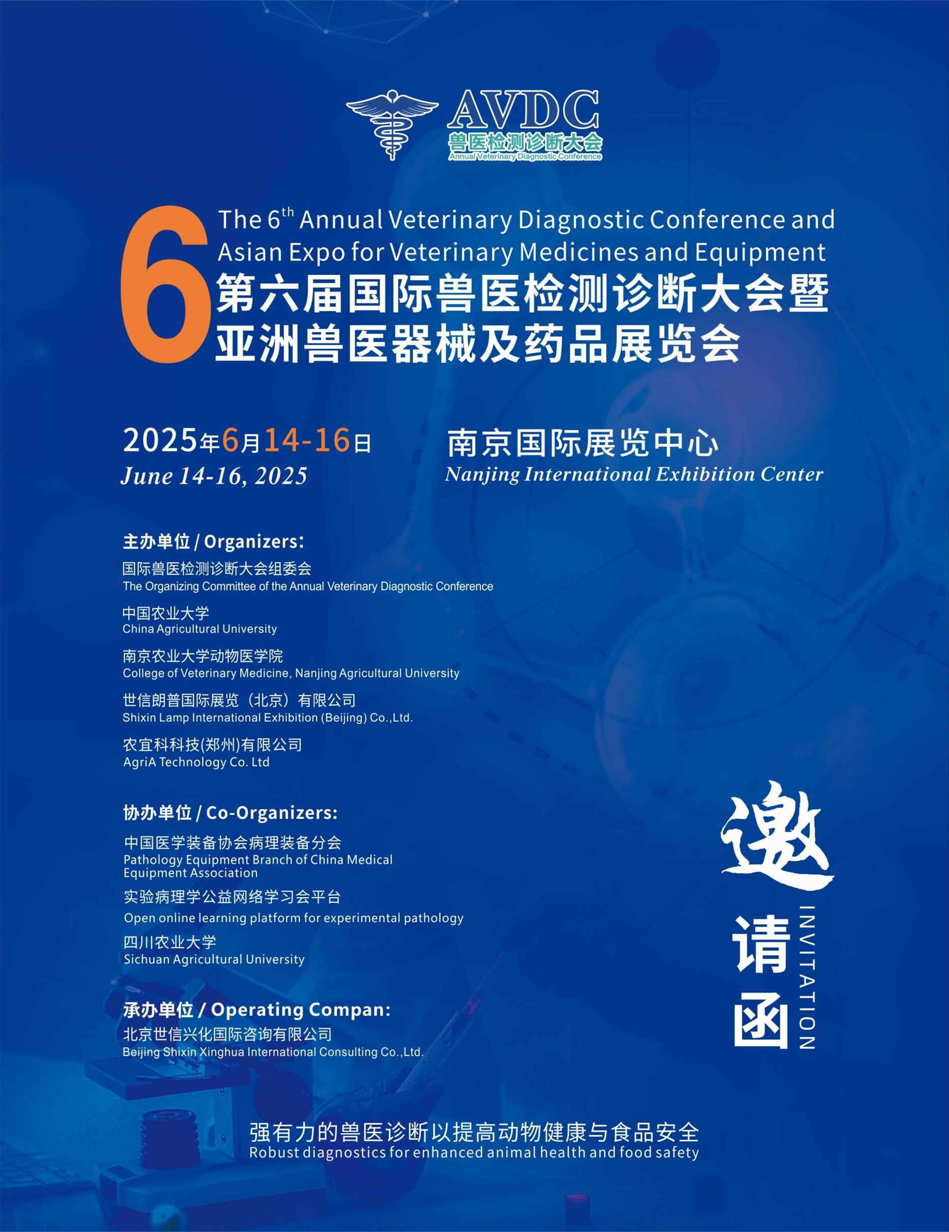 第六届国际兽医检测诊断大会定于2025年6月14-16日在南京国际展览中心举行,大会将继续秉承“强有力的兽医诊断,以提高动物健康与食品安全”的办会宗旨,重点邀请亚、美、欧国家权威兽医检测诊断专家主讲,为参会代表带来全球兽医检测行业的最新进展,分享实验病理学、分子诊断、病毒学/血清学、微生物学、兽医检测的认证、现场快速检测、实验室安全、实验室质量管理等领域的国际最新资讯和研究成果。本届兽医检测大会参会代表预计超过3000人。