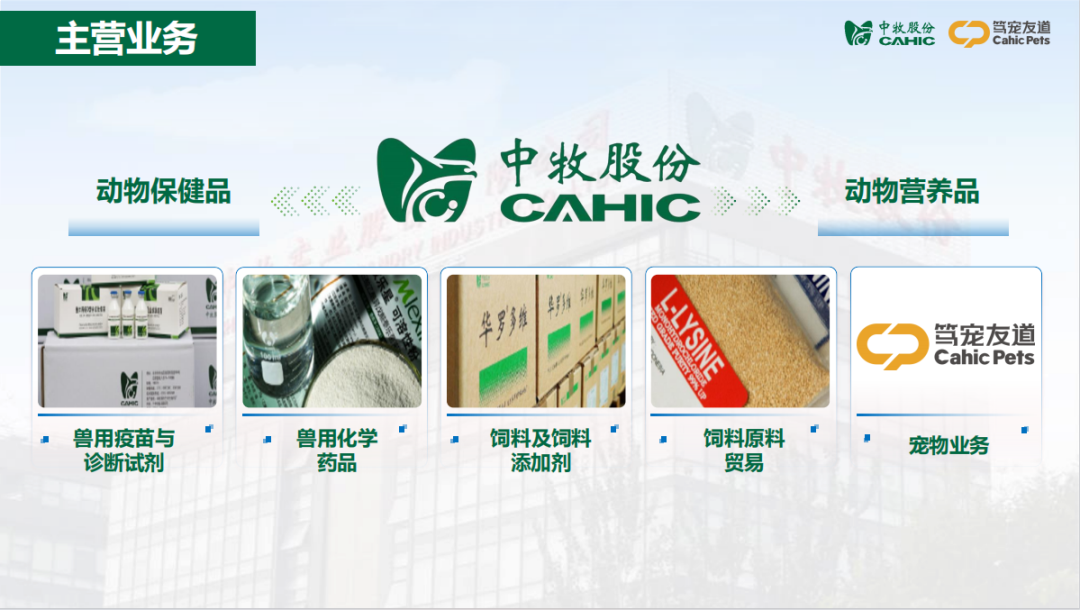 中牧股份隶属于国务院国资委直接管理的大型综合性农业中央企业中国农业发展集团有限公司。作为国资央企,公司专注于畜牧产业链供应链上游的兽用生物制品、兽药、饲料及饲料添加剂和原料贸易等核心业务,是国家重大动物疫病防治的产业支撑体系、现代饲料工业的产业促进体系,现代畜牧业的产业服务体系,是我国畜牧业的国家队、主力军。公司拥有技术工艺领先、产品品类丰富、保障能力强大的产业集群,在国内设立了21个生产基地,所属骨干企业的研发制造历史超过90年。